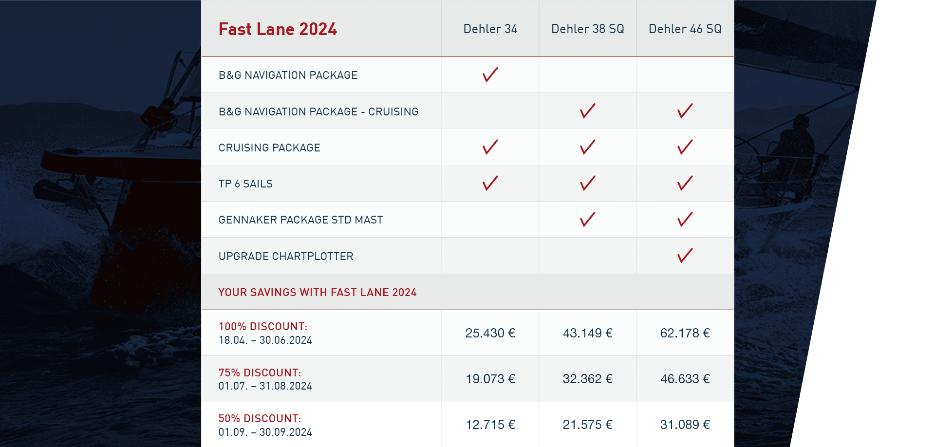 Il y a beaucoup à dire sur le fait de faire construire son nouveau Dehler pendant la saison de navigation en cours. Le bateau quitte notre chantier naval plus rapidement et est livré avec des équipements de haute qualité dans d'excellentes conditions. Nous avons soigneusement assemblé les composants du pack : Ils reflètent exactement l'expérience de navigation que vous attendez de Dehler - dynamique, confortable et techniquement à la pointe du progrès. Si vous voyez le yacht de vos rêves ci-dessus, empruntez la FAST LANE dès maintenant.